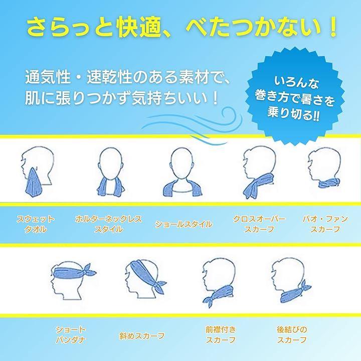 「水だけでひんやり冷感」 水に濡らして絞って振るだけ。すぐに冷たくなるから、屋外活動や運動中のリフレッシュに最適です。