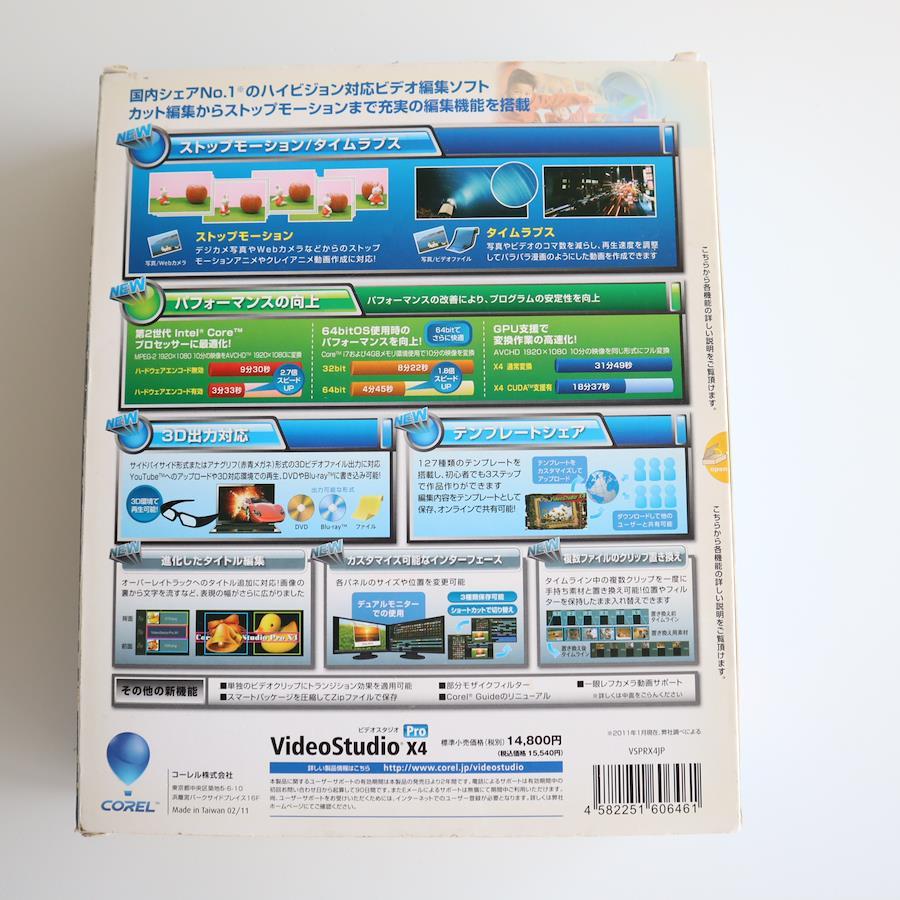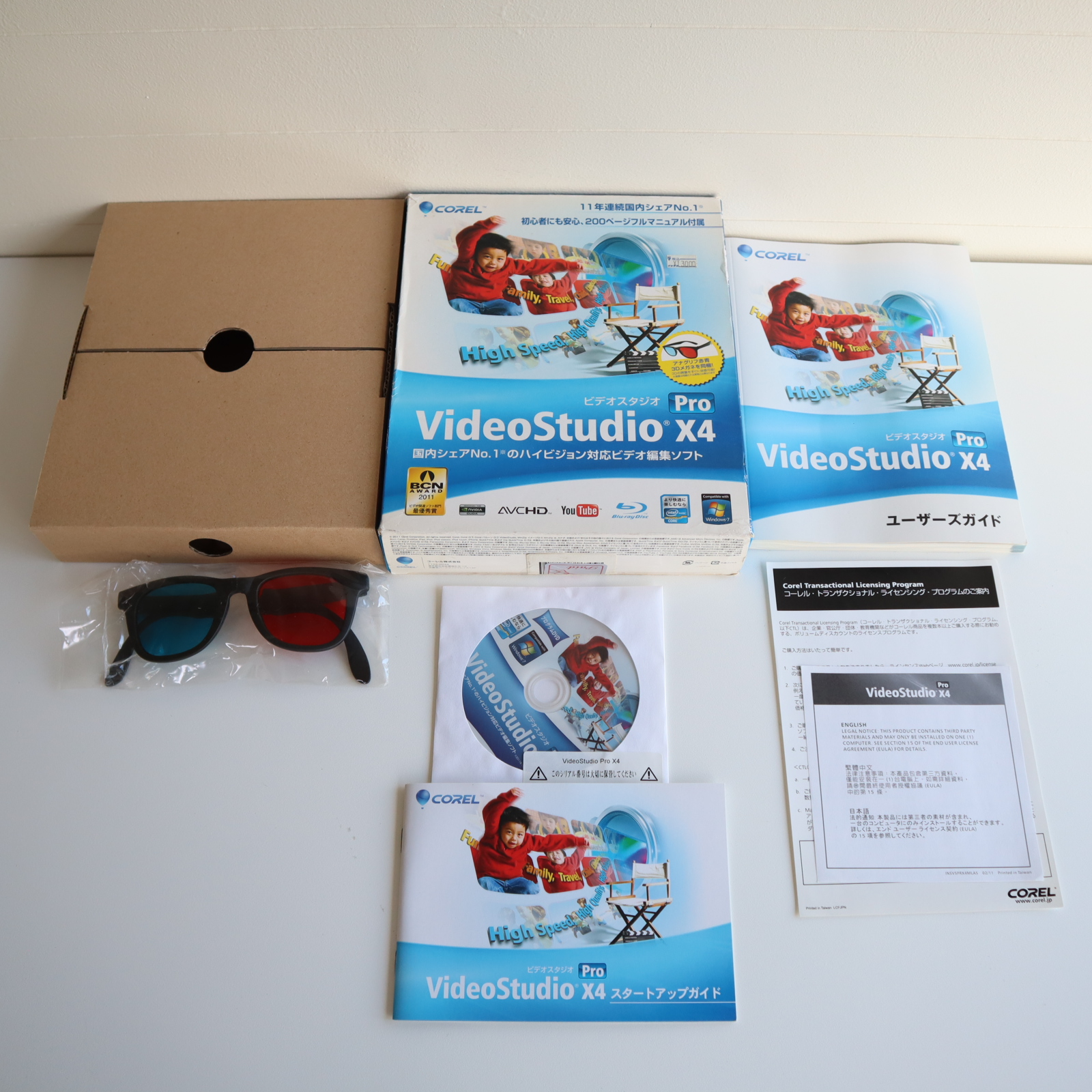 【詳細】■ 商品名・モデル:Corel VideoStudio Pro X4■ ブランド:Corel(コーレル)■ 対応OS:Windows XP / Vista / 7■ 状態:- 外箱にスレや角の潰れあり- CD-ROM盤面に大きな傷は見られません- 動作確認:現行PC環境がなく未確認■ 付属品:- インストールCD- ユーザーズガイド- スタートアップガイド- ライセンス関連書類- 3Dメガネ(未使用・袋入り)- 外箱