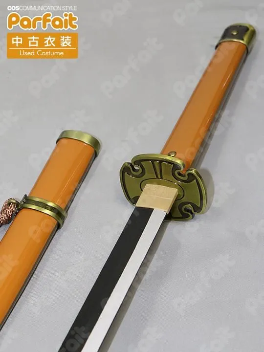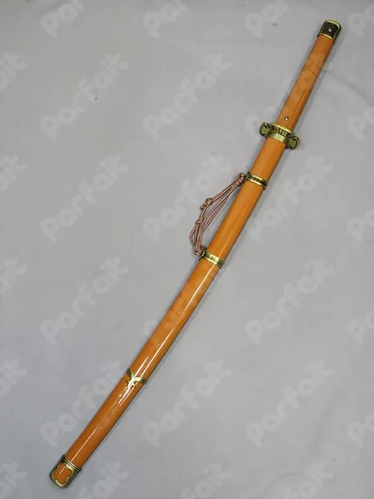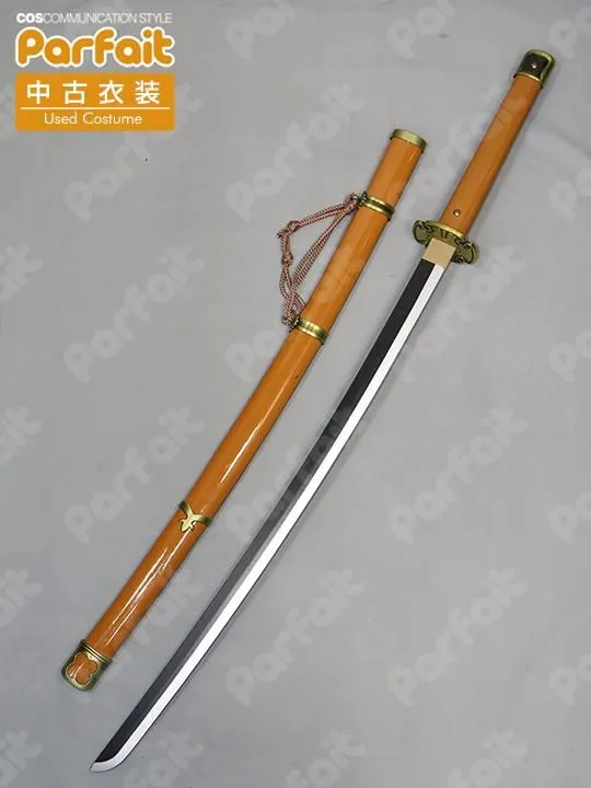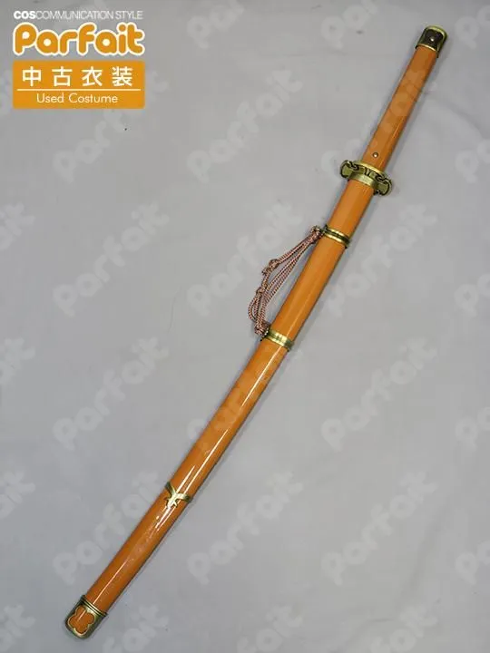 【セット内容】模造刀(約103cm)【コメント】比較的状態の良い木製の模造刀です。全長約103cm、刀身の長さ約68cmです。刀身は白黒で塗色されています。鍔や鞘は特装されており、鞘などに若干くもりやキズがあります。