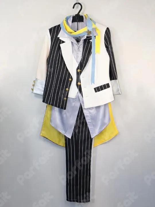 【セット内容】上着、ベスト、ブラウス、ズボン、首リボン、腰チェーン、腕飾り【生地の種類】ポリエステル【コメント】キャラクター共通のアイドル衣装です。ベルトがありません。衣装のストライプ柄は昇華プリントです。ブラウスはサテン生地で作られており、左袖肩部にうっすらと赤色の汚れがあります。上着の袖部は合皮製で一部折れ目に小さな表面剥がれが見られます。(2025/11時点)リボン飾りはマジックテープで着脱します。ズボンの白地に若干汚れがあります。