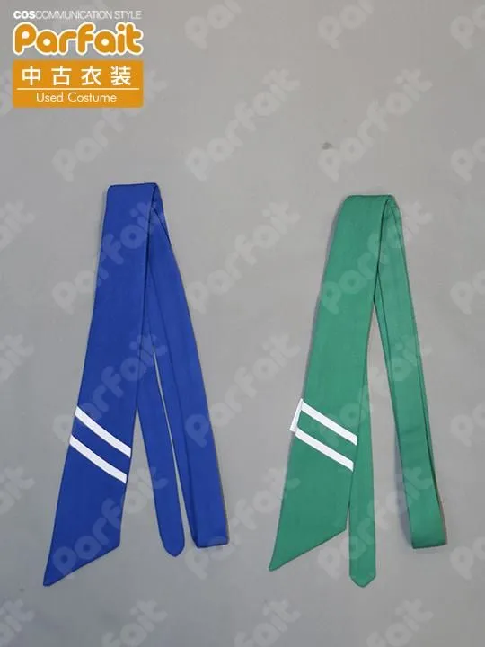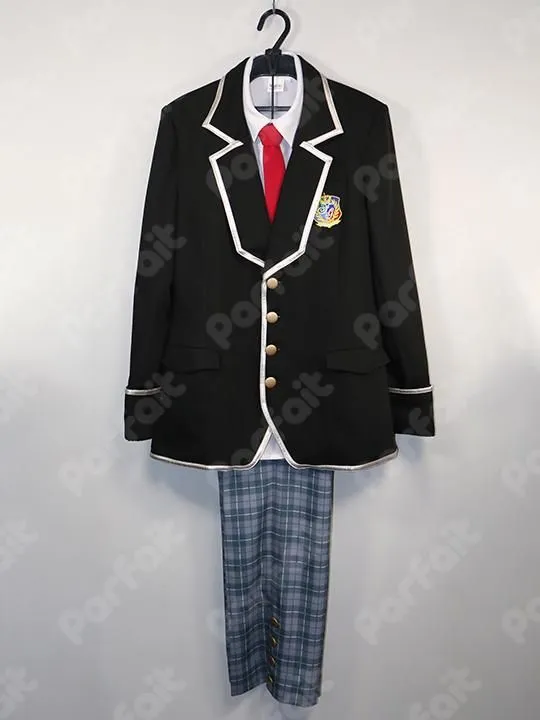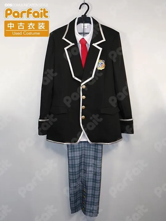 【セット内容】上着、ブラウス、ズボン、ネクタイ3種【生地の種類】ポリエステル【コメント】Acos製。公式ライセンス品のブレザー制服衣装です。ネクタイは3種類付属しています。ズボンの柄は昇華プリントで再現されており、ウエストには一部ゴムが入っています。ポケットには実用性があります。校章は刺繍ワッペンです。上着の銀ラインは合皮で、劣化により袖ラインなどに表面割れや剥がれが見られます。(2026/3時点、通常の条件、および合皮劣化を事由とする返品は不可)