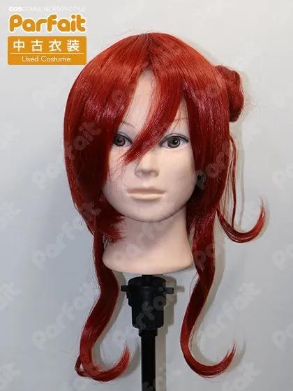 米女メイ用にセットされたウィッグです。やや暗めの赤色の色味です。お団子パーツはバンスクリップで取り付けられます。サイドの毛髪は若干長めで、前髪などにカット加工があります。前髪や背面に一部整髪料の跡があります。