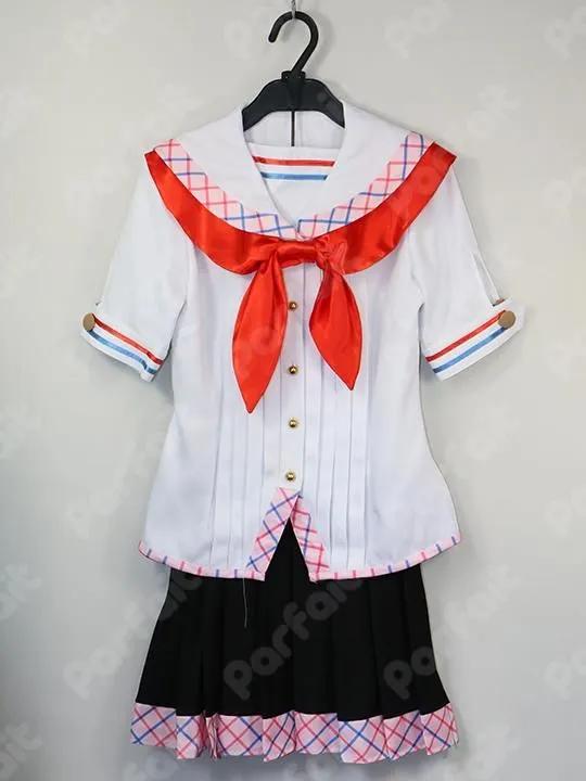 【セット内容】セーラー服、スカート、スカーフ、靴下【生地の種類】ポリエステル【コメント】未使用品の一般学生の制服衣装です。バスト約86cmウエスト約60cmです。セーラー襟やスカートの裾柄は昇華プリントです。スカートの左側にはスリットがあります。製造時のチャコペン残りなどが見られ、靴下に一部青い汚れが見られます。