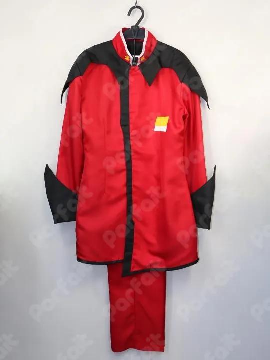【セット内容】上着、ズボン、ベルト、ブーツカバー【生地の種類】ポリエステル【コメント】赤の制服衣装です。上着は正面のスナップボタンで着脱できます。ベルトやブーツカバーは合皮製で状態は比較的良好です。上着の模様は合皮貼り付けで簡易的に再現されています。(2025/10時点)上着の袖やズボン裾などに一部色ムラが見られます。