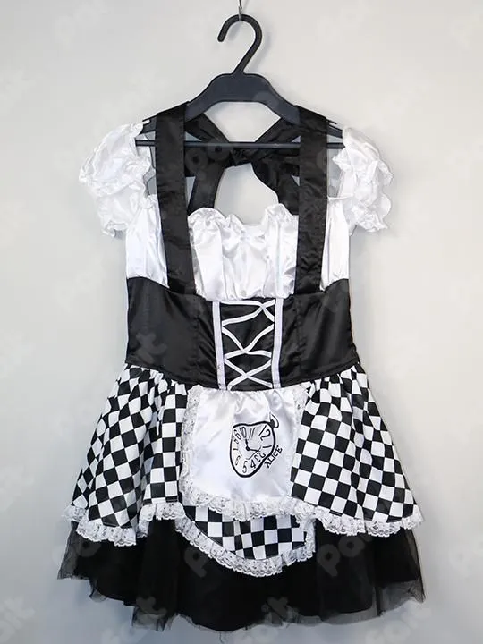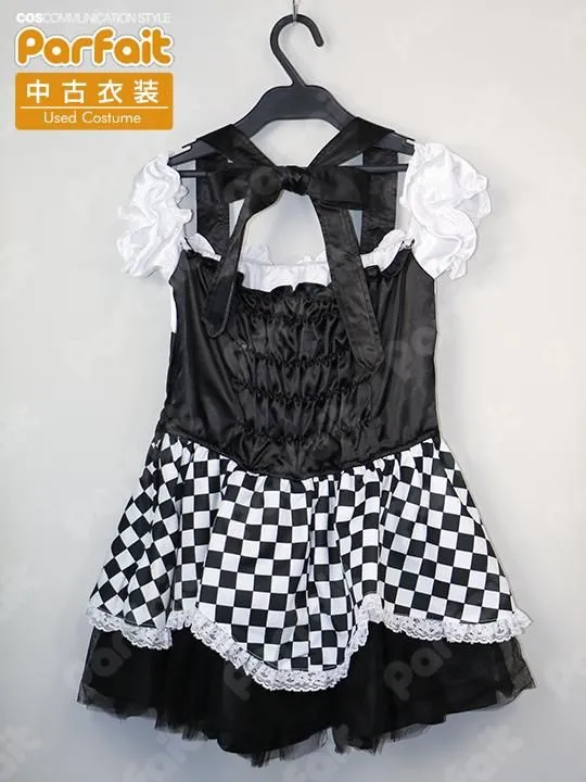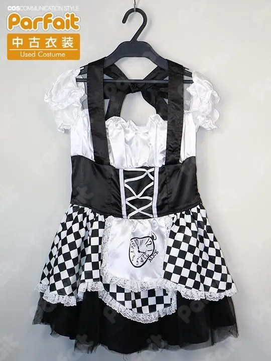 【セット内容】ワンピース、カチューシャ【生地の種類】ポリエステル【コメント】汎用的な白黒のワンピース衣装です。主にサテン生地で作られており、エプロンの模様や市松模様柄は生地プリントです。オフショルダーの形状で、背中はゴムシャーリングです。