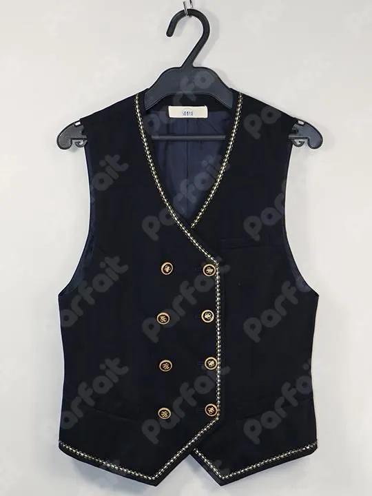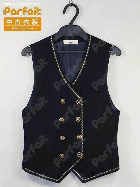 【セット内容】ベスト【生地の種類】ポリエステル【コメント】汎用的な紺色のベストです。バスト約80cmでダブルボタンの形状です。ポケットには実用性があります。