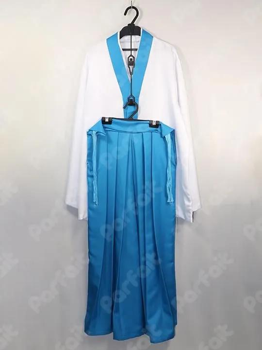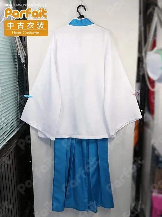 【セット内容】着物、袴、帯【生地の種類】ポリエステル【コメント】白と水色の着物衣装です。身幅約59cmで、袴は腰紐で着脱できサイズの融通が利きます。着物の半襟部分はマジックテープで留めて使用します。着物の袖や正面裾・帯などに一部シミ汚れが見られます。Gintama