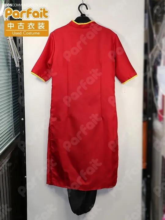 【セット内容】チャイナ服、ズボン、髪飾り【生地の種類】ポリエステル【コメント】赤のチャイナ服衣装です。薄手のポリエステル生地を使用しており、チャイナ服は裾丈が長めです。ズボンはゴムウエストです。髪飾りはプラスチック製で質感が良く、裏のコームピンで着脱できます。チャイナ服の正面下部に一部うっすらとくすみ汚れがあります。
