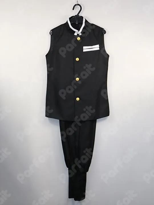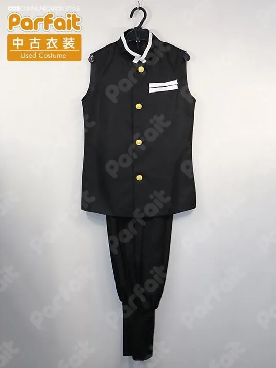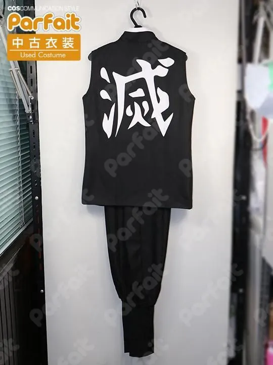 【セット内容】上着、ズボン、ベルト、手甲、手首飾り、二の腕飾り、脚絆、包帯類、ウィッグ【生地の種類】ポリエステル【コメント】ウィッグが付属した、宇髄天元仕様の鬼殺隊制服です。頭飾りが一部ありません。ズボンはゴムウエストです。背中の文字はプリントです。ベルトや腕飾りなどは合皮製で状態は比較的良好です。(2026/3時点)ウィッグはクラッセ製のシャギースタイルで前髪などの毛髪にややカット加工があり、内側に若干赤色の汚れがあります。