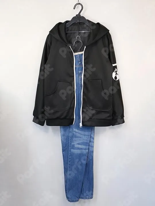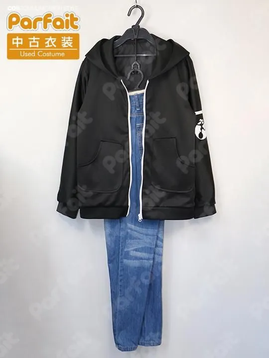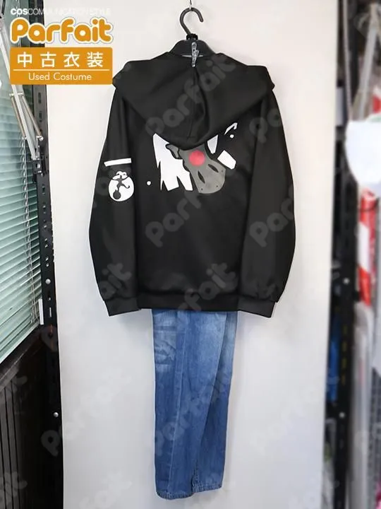 【セット内容】パーカー、ズボン【生地の種類】ポリエステル【コメント】2019年冬コミケのイラスト衣装です。インナーや装飾品がありません。パーカーはジャージ系の生地が使われておりポケットには実用性があります。背中や袖の模様は生地貼り付けで、白地に一部黒の色移りがあります。ズボンは既製品でウエスト約73cmです。ズボンのデニム生地にダメージ加工があります。
