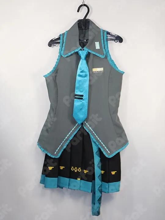 【セット内容】上着、スカート、ネクタイ、腕カバー、靴下、髪飾り、ウィッグ【生地の種類】ポリエステル【コメント】ウィッグが付属した通常衣装です。主にポリエステル生地で作られており、飾りベルトはスカートに縫い付けられています。模様類はプリントで、一部印刷かすれが見られます。腕カバーの模様部分にはエナメル合皮が使われており、状態は比較的良好です。(2025/10時点)ウィッグはバンス部分に油性ワックス系の整髪料が付着しておりまとまりがあります。Vocaloid series