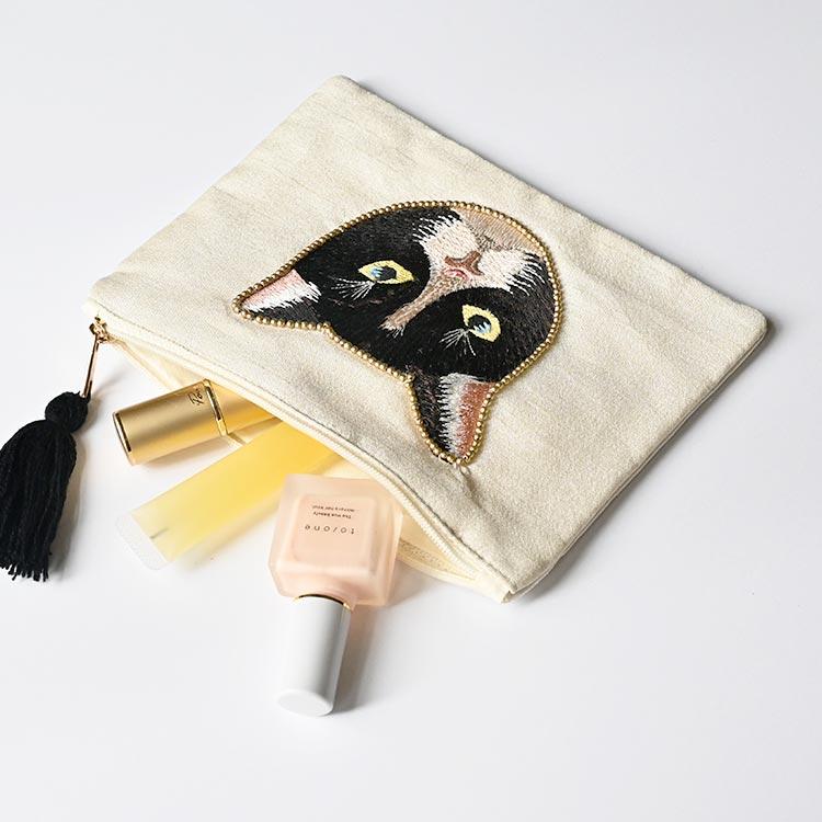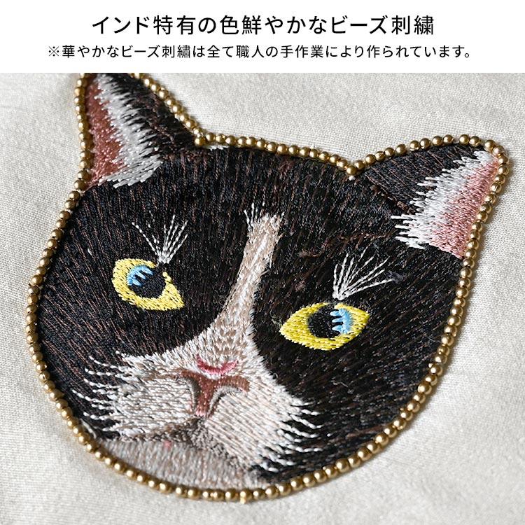 【アニマル刺繍フラットポーチ】インド特有の色鮮やかなビーズ刺繍が施されたファブリックシリーズの、ネコとレオパードのお顔がモチーフの刺繍フラットポーチ。華やかなビーズ刺繍は全て職人の手作業により作られている温かみのあるデザインです。持ち歩きの化粧ポーチとしてや小物入れにぴったりのサイズ感です。