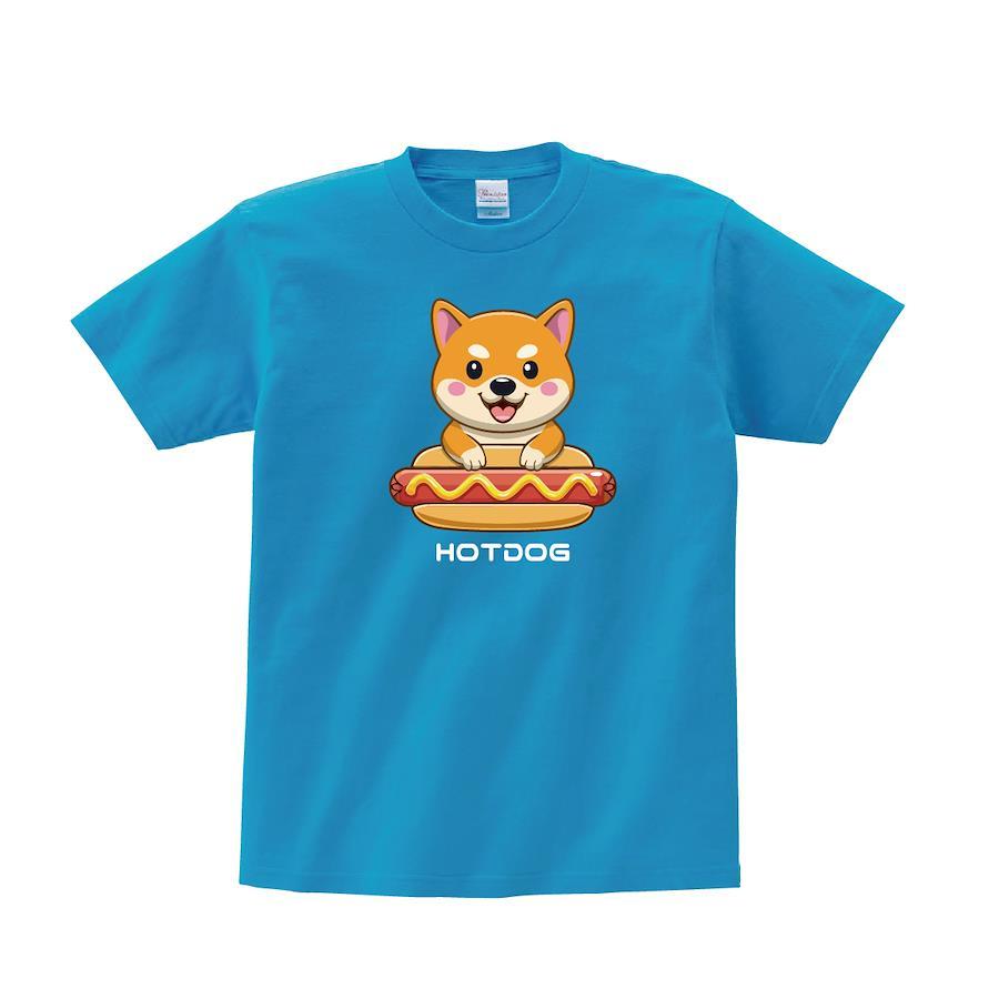 ホットドッグを食べようとしているかわいい柴犬のTシャツです。※画像ははめ込み画像となり、実際とは多少異なりますので予めご了承ください。 ※サイズ表をよくご確認の上ご購入ください。 ※受注生産となるため、返品、交換はご遠慮ください。