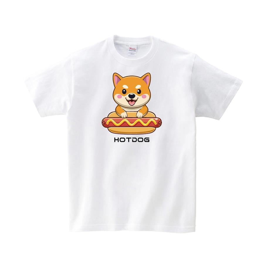 ホットドッグを食べようとしているかわいい柴犬のTシャツです。※画像ははめ込み画像となり、実際とは多少異なりますので予めご了承ください。 ※サイズ表をよくご確認の上ご購入ください。 ※受注生産となるため、返品、交換はご遠慮ください。