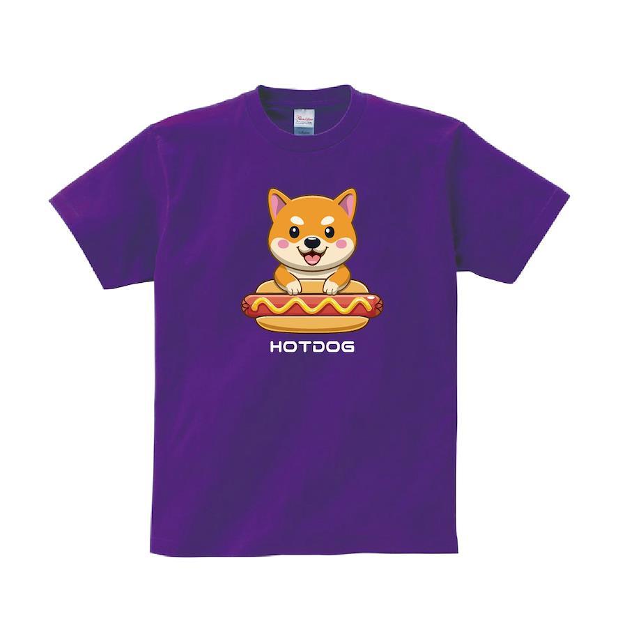 ホットドッグを食べようとしているかわいい柴犬のTシャツです。※画像ははめ込み画像となり、実際とは多少異なりますので予めご了承ください。 ※サイズ表をよくご確認の上ご購入ください。 ※受注生産となるため、返品、交換はご遠慮ください。