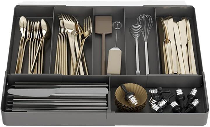「引き出し内を自由にカスタマイズ。」 3方向に伸縮するカトラリーケースで、収納スペースを活用。