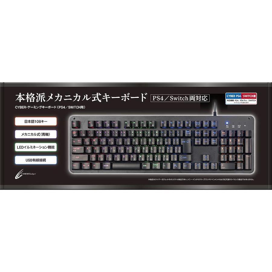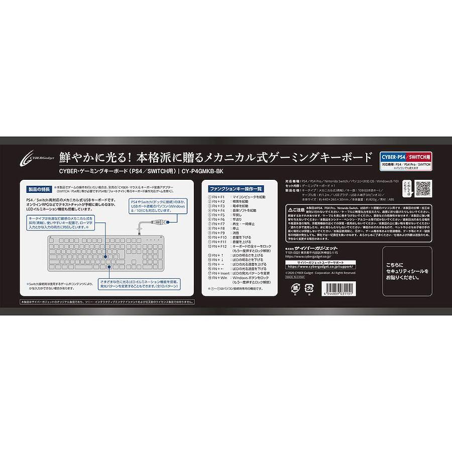 カラフルに光る快適な打鍵感のメカニカル式を採用したPS4/SwitchゲーミングUSBキーボードPS4/Switchのオンラインゲームでチャットに使用できるフルサイズのUSBキーボード。各種ゲーミングデバイスではおなじみの「光る」機能を搭載。全10パターンから光り方を変更でき、光る早さの調節も可能。パソコン専用の機能として、押し間違いを防ぐ「Windowsキーロック機能」、FPSなどで役立つWASDキーとカーソルキーの割り当てを入れ替える機能も搭載。