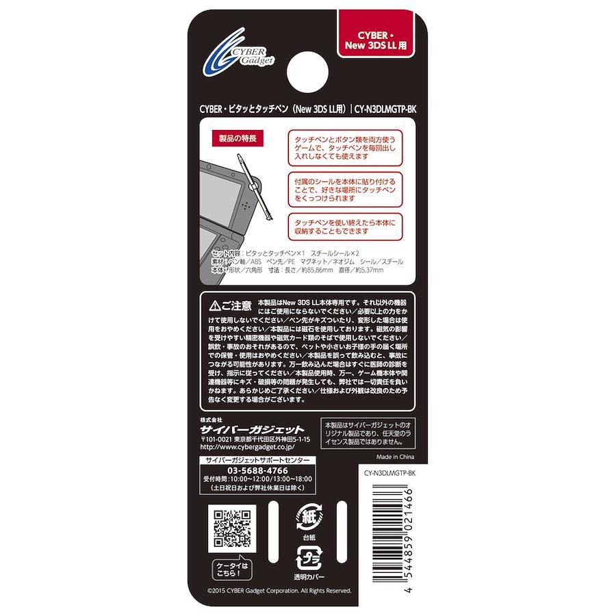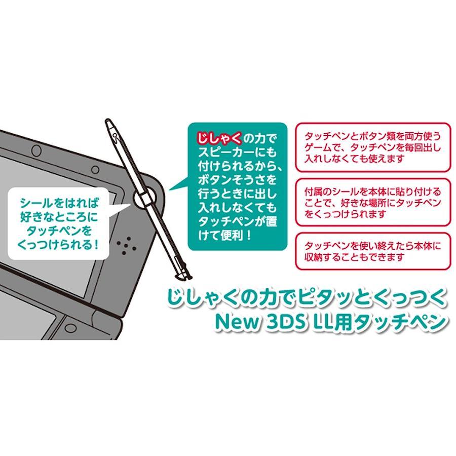・対応機種:New 3DS LL・セット内容:ピタッとタッチペン×1、スチールシール (カラー:ブラック) ×1・素材:ABS (ペン軸) 、POM (ペン先) 、ネオジウム (マグネット) 、スチール (シール)・サイズ:長さ 約85.86mm、直径 最大約5.37mm