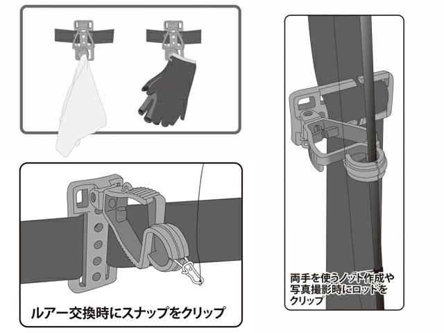 タオルやグローブといったものだけでなく、スナップなどの小物からロッドまでクリップできる。