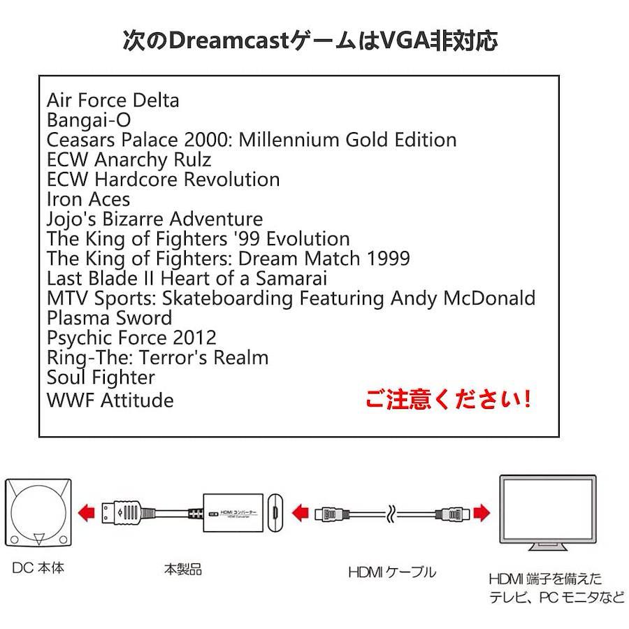 Dreamcast to HDMI Converter: This is a converter that allows you to convert games to HDMI output with "Dreamcast" body. Note: This is not a genuine Sega part Plug and Play: Just plug it into the video output port of the DC unit (Dricas) to output HDMI as is. No external power supply is required, and it comes with a 4.9 ft (1.5 m) HDMI cable, just plug it and it is ready to use Support Resolution:Support all 480i, 480p, 576i (PAL), Dreamcast console You can enjoy DC games as well as TV and PC monitors with HDMI connectors This product converts the VGA signal output from DC to HDMI signal, so there is no HDMI output in some titles that do not support VGA output. Please be aware of