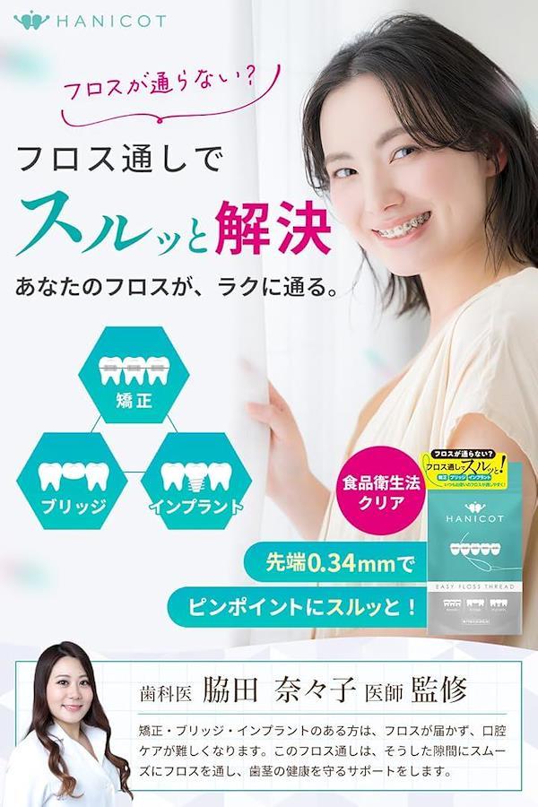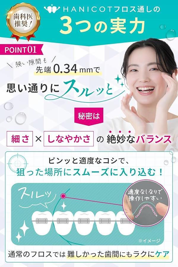 「狭い歯間にもスッと入る極細設計」 先端わずか0.34mmのフロス通しだから、ワイヤー矯正やブリッジ、インプラントの隙間でも、ムリなくスルッと通せます。