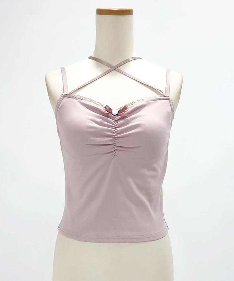 キャミタイプのホルターネック紐はクロスして後ろでリボン結びしても可愛いし、前に垂らしてチョーカー風にしてもOK!