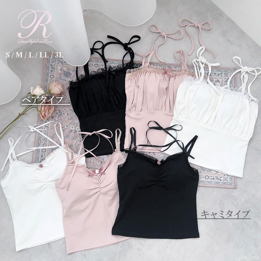キャミソールタイプは、前中心にバラリボンが付いており、さらにホルターネック紐付きでトレンド感のあるデザイン。
