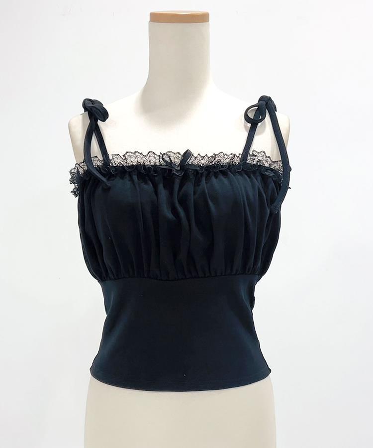 キャミタイプのホルターネック紐はクロスして後ろでリボン結びしても可愛いし、前に垂らしてチョーカー風にしてもOK!