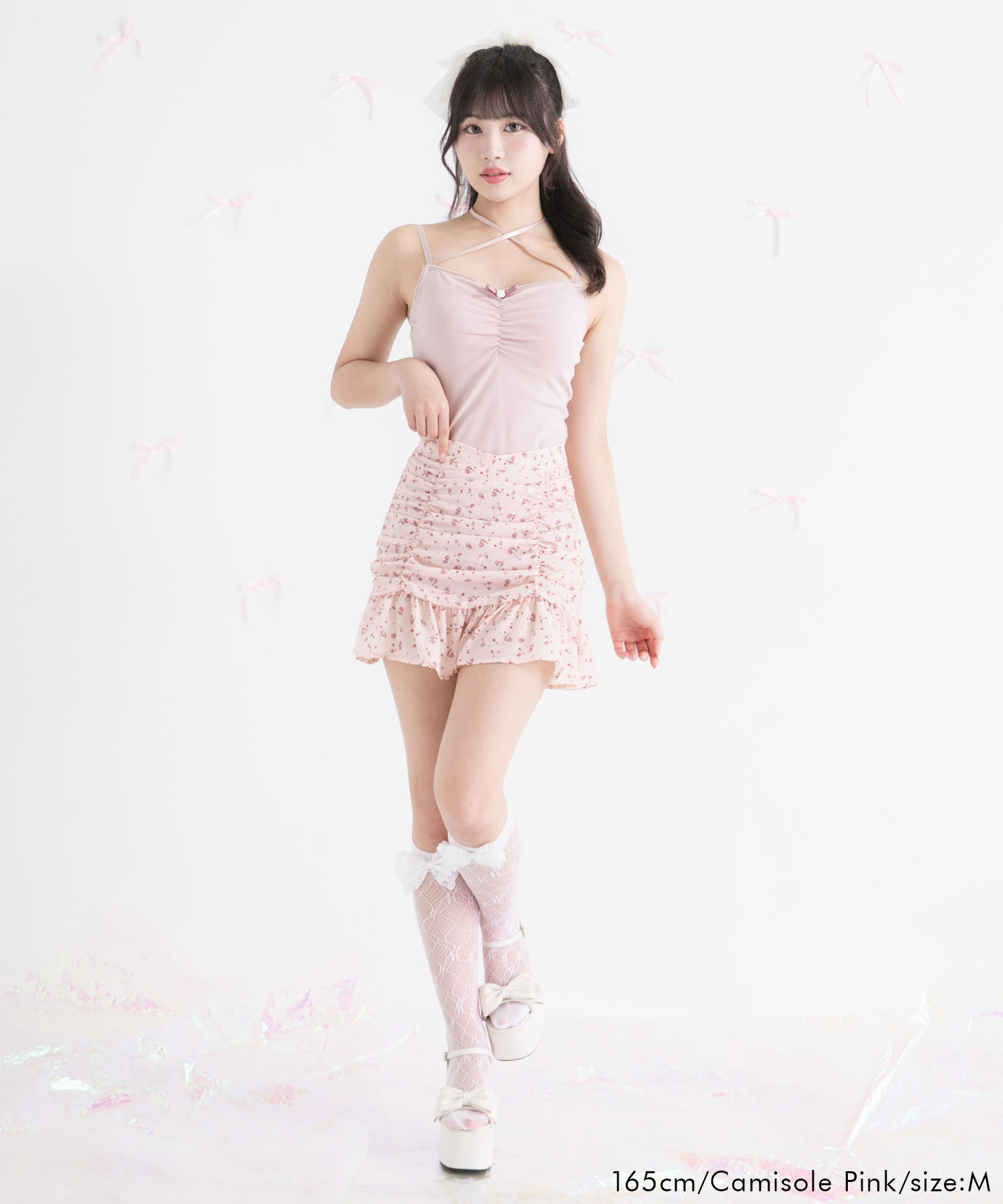 キャミソールタイプは、前中心にバラリボンが付いており、さらにホルターネック紐付きでトレンド感のあるデザイン。