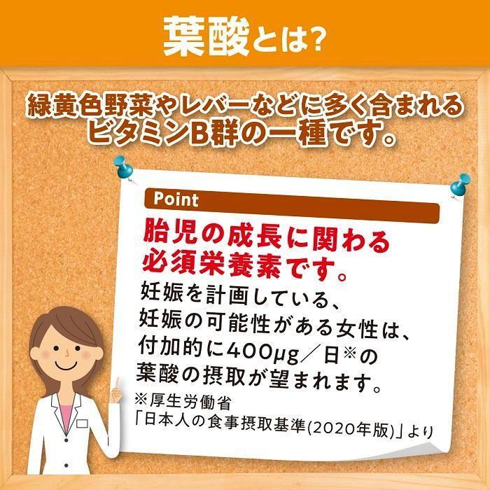 厚生労働省が妊娠を希望する女性、または妊娠の可能性がある女性に、食品からの摂取に加えて、栄養補助食品から摂るよう推奨している、葉酸400μgを配合しました。