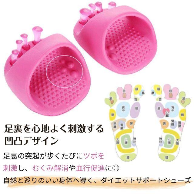 履くだけ簡単!足指から始める美姿勢&美脚+足元ケアができるダイエットスリッパです。【姿勢が自然に整う】土踏まずを支えるアーチ構造が重心と体幹を安定させ、美姿勢に整えます。【履くだけで手軽に足元ケア】4本のやわらかい突起が自然に足指を広げ、正しい位置にキープ!足指を開くことで、癖づいた指の位置を自然な状態に戻し、外反母趾や浮き指などのゆがみをフォローします。かかと部分が短く、つま先重心の半足裏設計で自然とバランスを取るため、体幹や下半身の筋肉が鍛えられ、美姿勢・美脚へと導きます!足裏の突起が歩くたびにツボを刺激し、むくみ解消や血行促進に◎汚れても丸洗いが可能。足指パッドは簡単に着脱ができ、簡単にお手入れができます。履くだけで自然と巡りのいい身体へと導く、ダイエットサポートシューズです。
