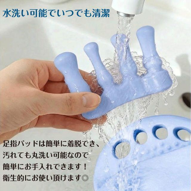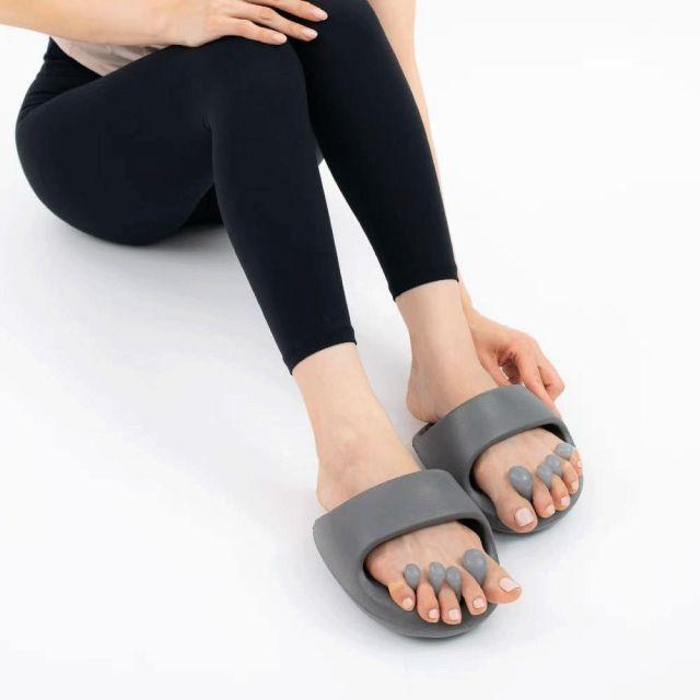履くだけ簡単!足指から始める美姿勢&美脚+足元ケアができるダイエットスリッパです。【姿勢が自然に整う】土踏まずを支えるアーチ構造が重心と体幹を安定させ、美姿勢に整えます。【履くだけで手軽に足元ケア】4本のやわらかい突起が自然に足指を広げ、正しい位置にキープ!足指を開くことで、癖づいた指の位置を自然な状態に戻し、外反母趾や浮き指などのゆがみをフォローします。かかと部分が短く、つま先重心の半足裏設計で自然とバランスを取るため、体幹や下半身の筋肉が鍛えられ、美姿勢・美脚へと導きます!足裏の突起が歩くたびにツボを刺激し、むくみ解消や血行促進に◎汚れても丸洗いが可能。足指パッドは簡単に着脱ができ、簡単にお手入れができます。履くだけで自然と巡りのいい身体へと導く、ダイエットサポートシューズです。