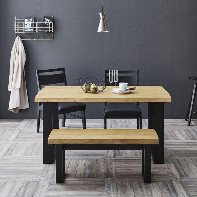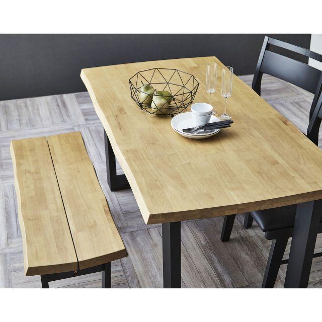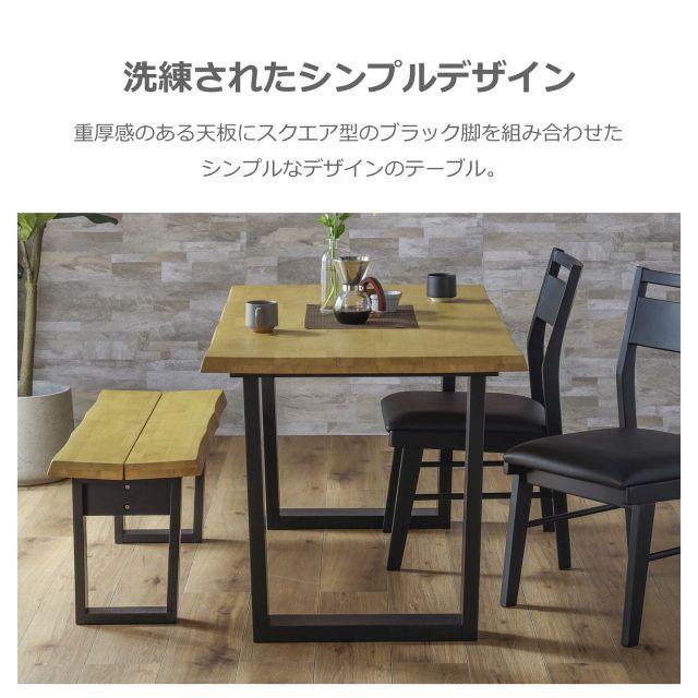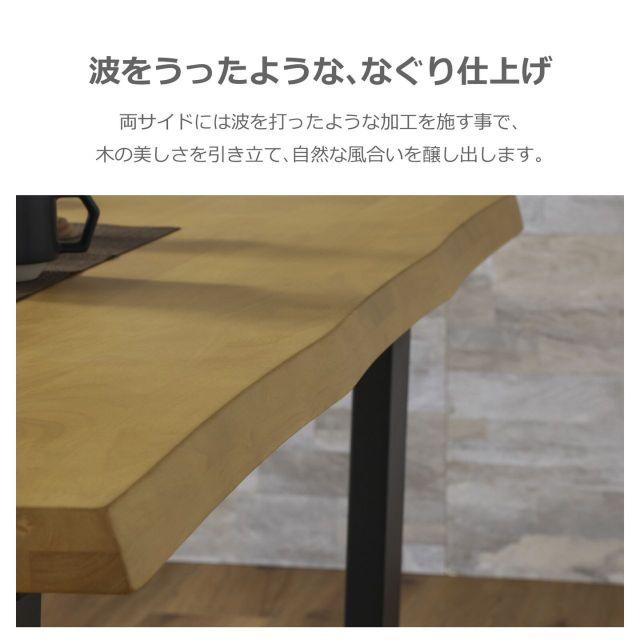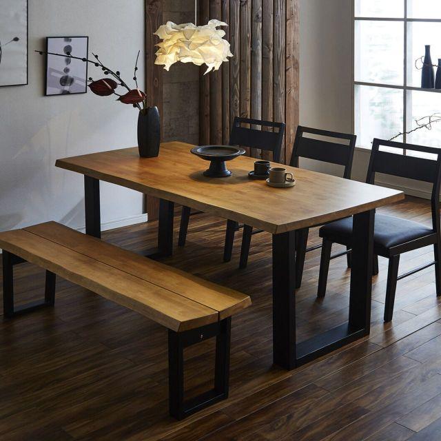●重厚感あふれる厚さ40mmの無垢材。●なぐり加工の自然な風合いとブラック脚が調和する、洗練された和モダンなダイニング空間を。●お手入れ簡単なアミノ塗装仕上げ。