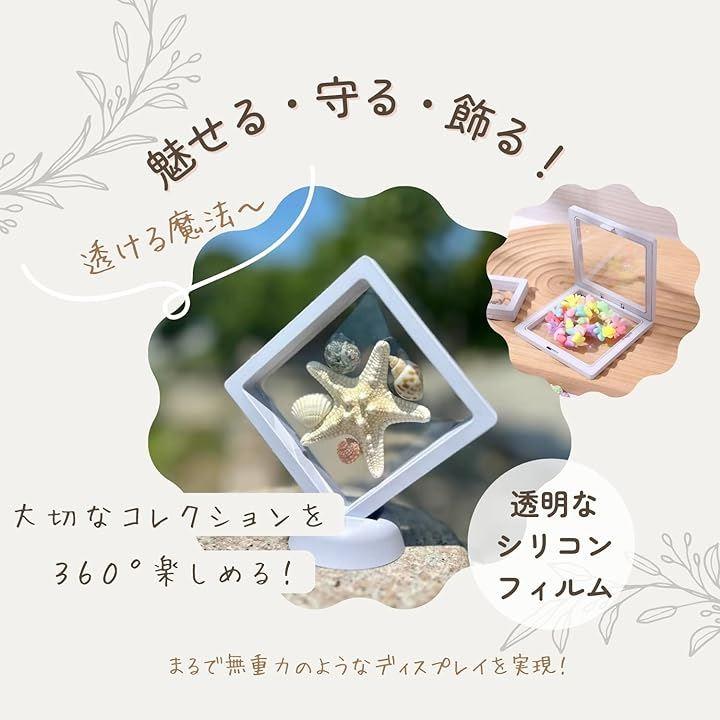 透明フィルムに挟むだけで、コインやアクセサリーを全方位から美しく飾れます。
