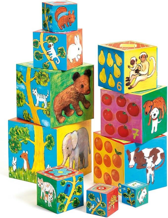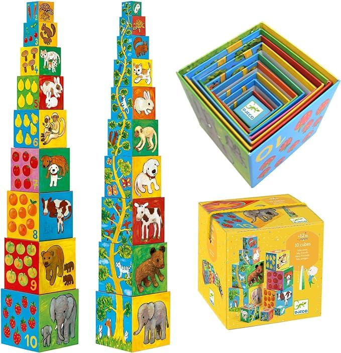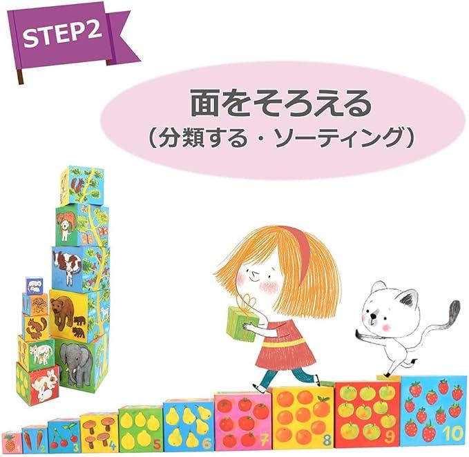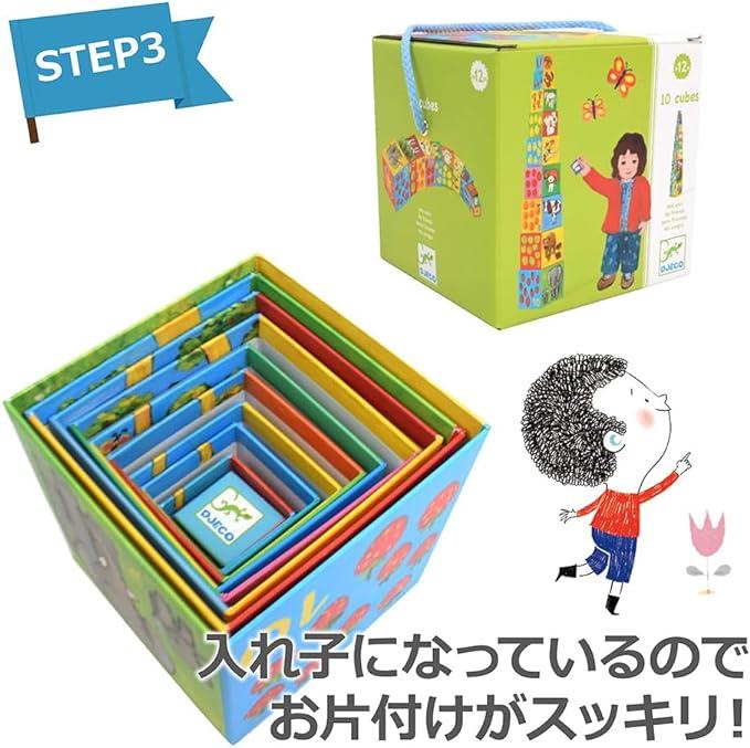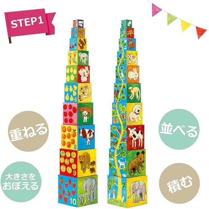 ■商品説明?【フランスDJECOの知育】【1歳からの積み木】【スタッキングキューブ】1歳からの知育におすすめ!積み上げたり、重ねたりして遊ぶスタッキングブロックです。タワーのように積み上げることもでき、また入れ子のように順番に入れることもできるので子どもは夢中になって遊びます。一番大きいブロックは一辺約14㎝。1歳の赤ちゃんにとっては大きいブロックなので、自由に積んだり重ねたりとダイナミックな遊びができます!?【遊びながら学べる】【大きさ・順番・数字】はじめは全てを積み上げるのは難しくても、自由に重ねたり積み上げたりさせることで箱の大きさの違いを感覚で認識するようになります。物の大小の認識や、順番に並べることで物の秩序性・法則性を認識できるようになります。また、ブロックの側面には様々な絵が描かれています。子供がその絵を見ながら、関連する事柄、数字を順番に並べることで大きさも順番に並べられるようになっています。?【入れ子になるのでコンパクトに!】 入れ子になっているので、入れたり、出したりを何度も繰り返して遊ぶことができます。お片付けもスッキリコンパクトに!スタッキング遊びを卒業したあとは、ブロックをひっくり返して、ペン立てや小物入れなどに使用できます。?【プレゼントや出産祝いにおすすめ】パッケージには持ち手になるひもがついていて、ジェコならではのおしゃれでかわいいイラストが目を引きます。1歳のお誕生日プレゼントや、出産祝いに大変喜ばれております。?【フランスの知育玩具ブランド DJECO ジェコ】DJECO(ジェコ)は1954年設立のフランスの4大おもちゃメーカーのひとつ。海外の様々なアーティストと共同でユニークで夢のあるおもちゃを制作しています。そのデザインはアート作品としても高い評価を得ており、これまでにヨーロッパのおもちゃ賞を数多く受賞、各国の美術館などでも販売されています。??【パッケージサイズ】15×15×15㎝ 【対象年齢】1歳 12か月から 【商品内容】 スタッキングキューブ 10個 全長約87㎝ 【デザイナー】Georg Hallesleben(ゲオルグ・ハレンスレーベン)?もっと見る