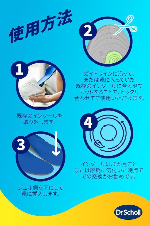●インソールをお使いの方は、ご使用のインソールを取り外し、ドクター・ショールジェルアクティブ?インソールをジェルの面を下にしてご使用ください。インソールが磨り減っている時は交換してください。6ヶ月毎の交換をお勧めします。