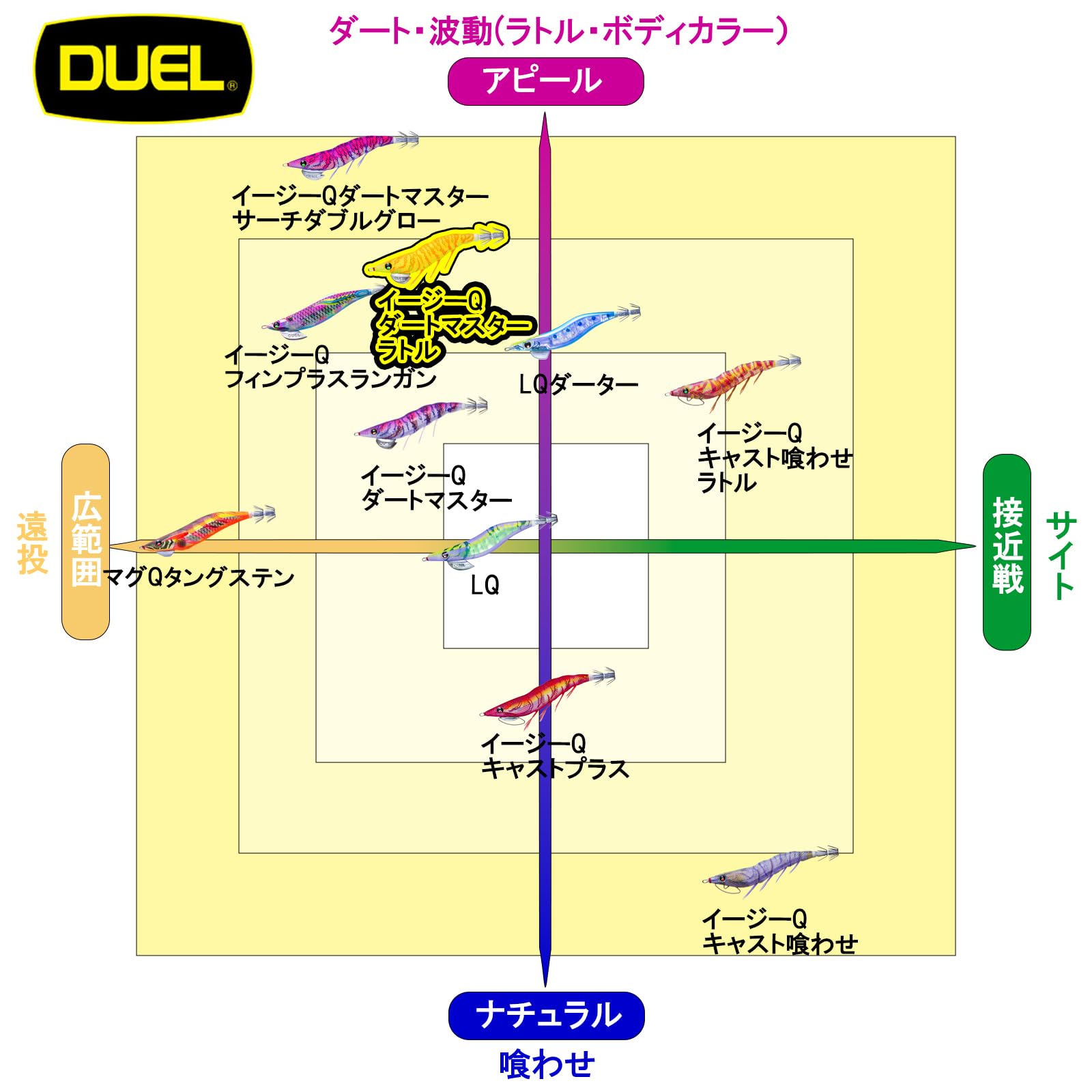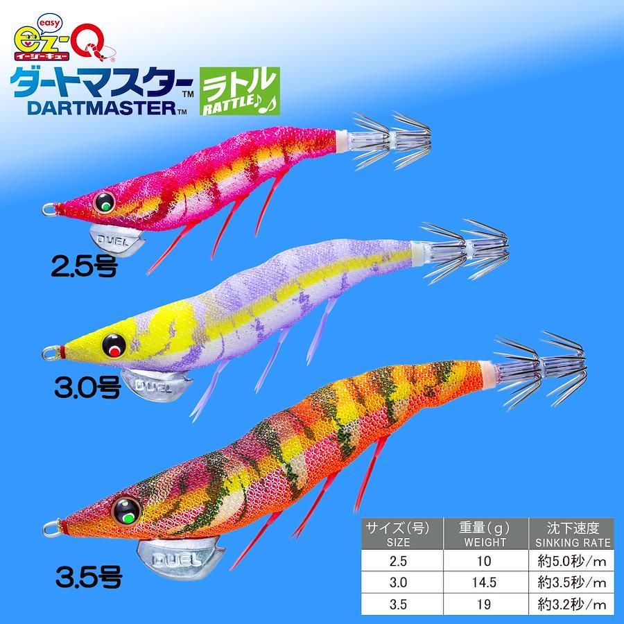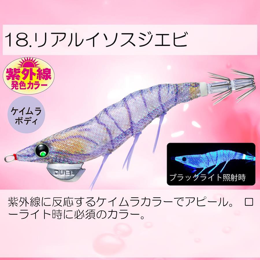 EZ-Qシリーズ史上、最強アピールの色と柄!! ●軽快ダートはそのままに「波動」「色」「音」で高活性のイカに、トリプルアピール!●色:全20色の色がスゴイ!!●音:アピール抜群のエビ音搭載!!●波動:パタパタフットライトの釣れる波動でアピール!!