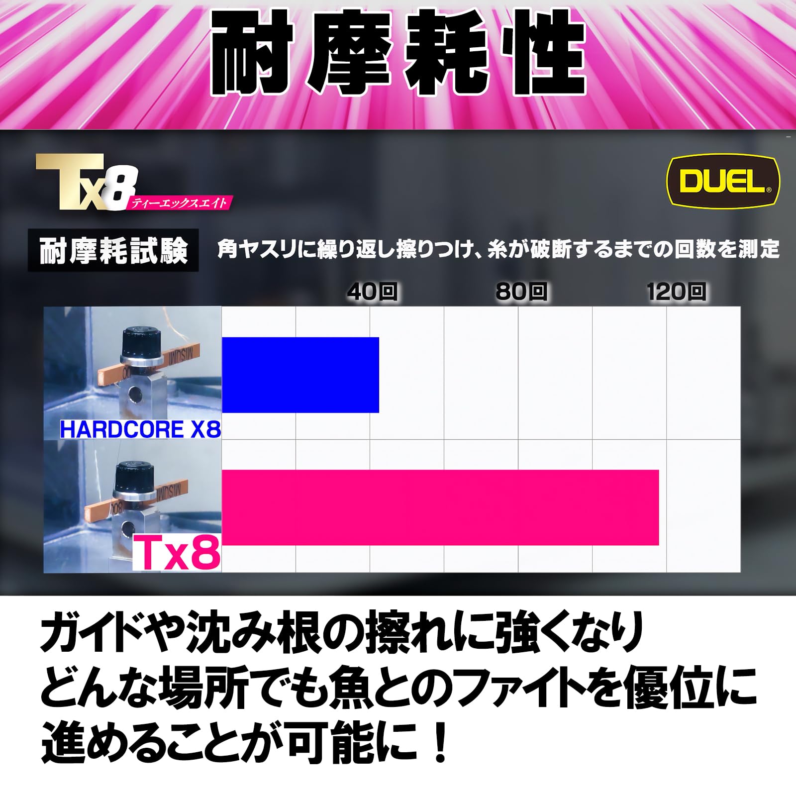 DUEL(デュエル)Tx8(ディーエックスエイト)! ! 強さ長持ち! "タフ8"タフなタイトブレイド(密編)新強力T原糸を新密編製法でタイトに仕上げることで、耐久性・耐摩耗性が大幅に向上。ハリやコシを感じさせない柔軟な質感で操作性アップ。新強力T原糸! 原糸の太さを変えることなく従来の構成繊維を太くすることで毛羽立ちにくく摩耗に強い! !