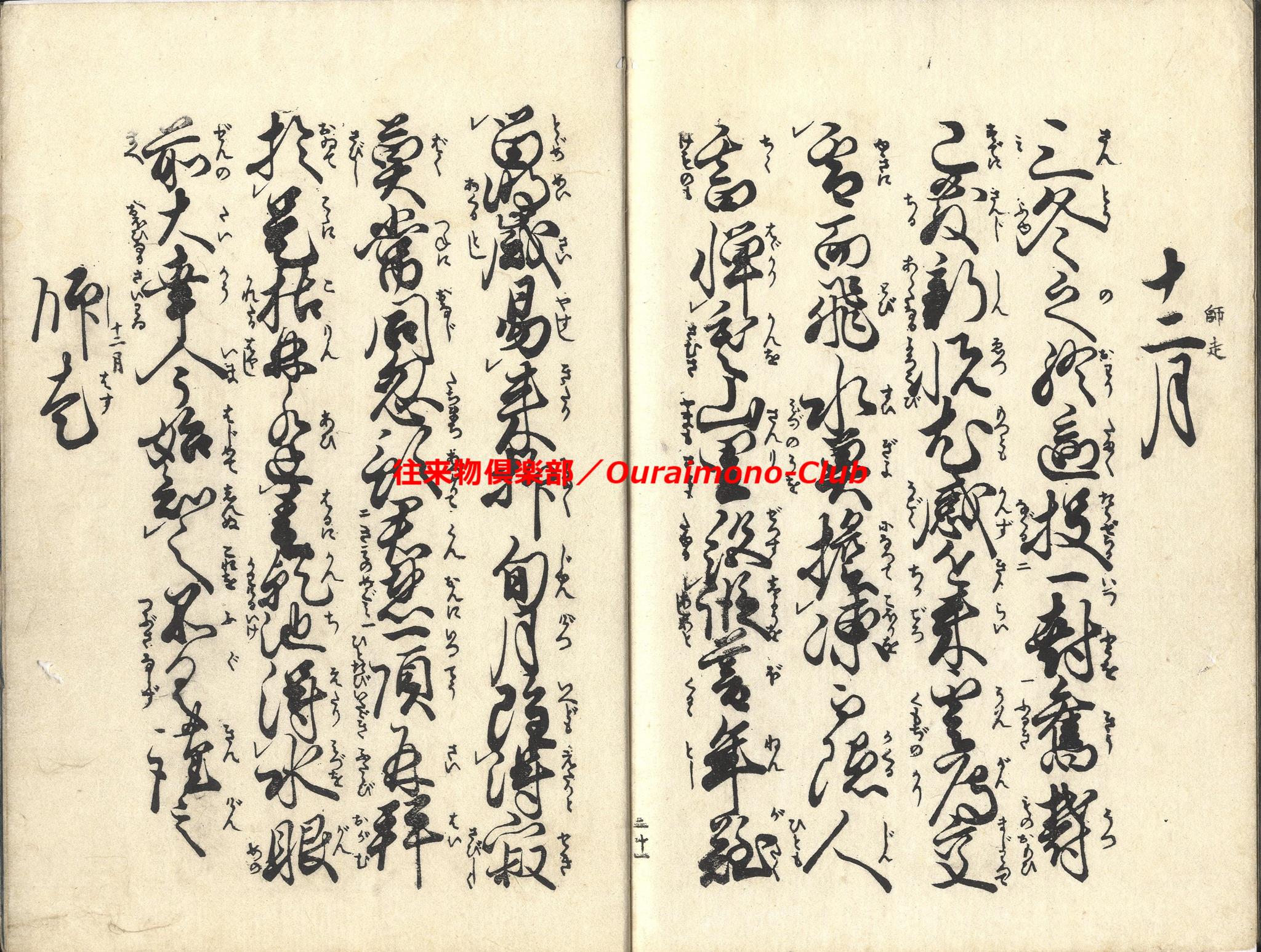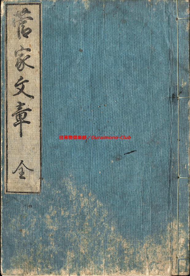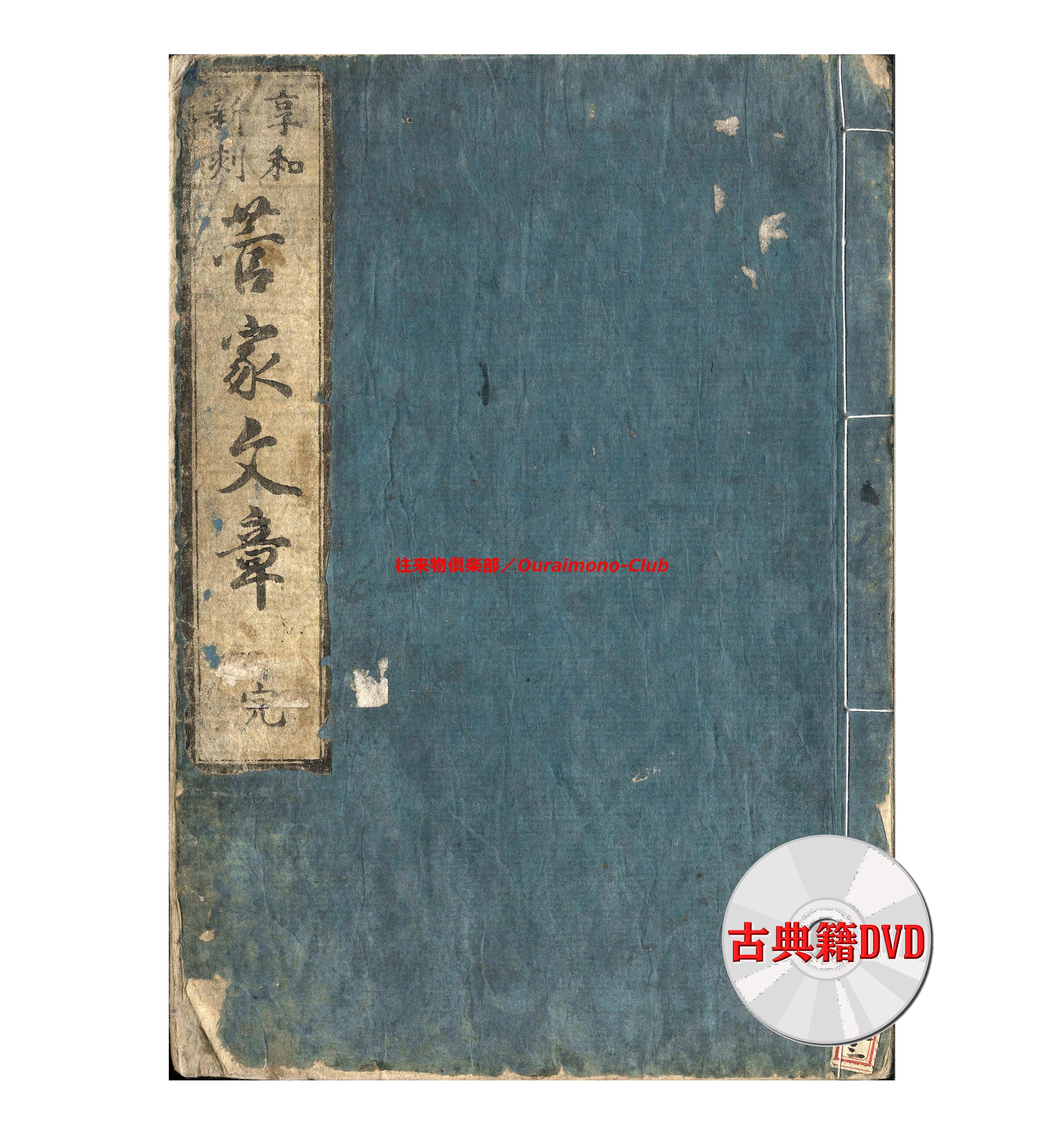 菅家文章(2種)【判型】半紙本1冊。享和板・天保板ともに縦227粍(天保板別本は225粍)。【作者】享和板:河原富蔵(青奴子)書。高井蘭山訓点。天保板:山隣堂東浩書。高井蘭山訓点。東条琴台序。【年代等】享和板:享和3年刊。[江戸]川村儀右衛門ほか板。天保板:天保7年再刊。[江戸]和泉屋市兵衛板。【備考】分類「往来物」。享和板と天保板(天保板は末尾に別本も抄録)の2種を全冊収録。本書は『十二月往来(菅丞相往来・菅家往来)』と同内容の古往来だが、特に、各状の前に置く月異名を省き、その代わりに、異名の一つを書状末尾に付すのが特徴。板種には享和3年板と天保7年再板本の2種あり、両者は同内容ながら版式・筆跡が全く異なる。すなわち、享和3年本は無界、天保7年本は有界で、いずれも大字・5行・付訓(所々左訓)で記す。また、享和板ではしばしば左訓や傍注を伴う点も大きな違いである。