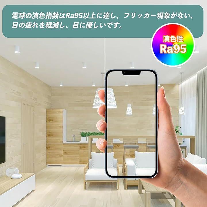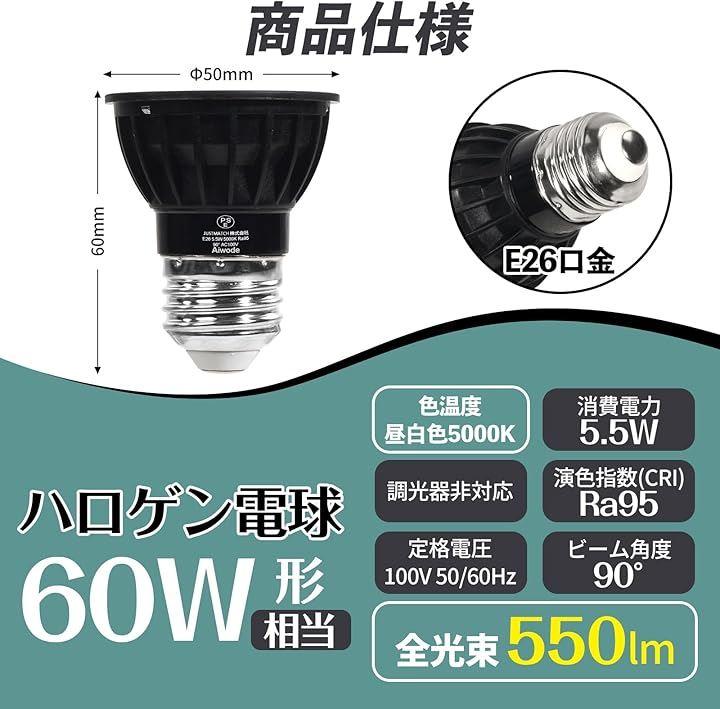 1、演色指数(CRI):95Ra、消費電力:5.5W、全光束:550lm、ビーム角度:90°、色温度:昼白色5000K、口金:E26、包装:5個入り、ボディカラー:ブラック、サイズ [外径x長さ]:50mm x 60mm。