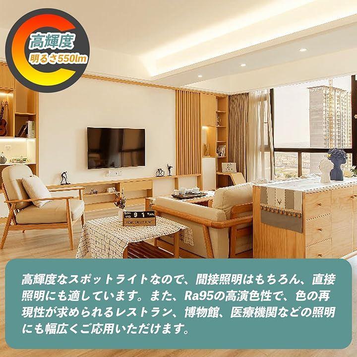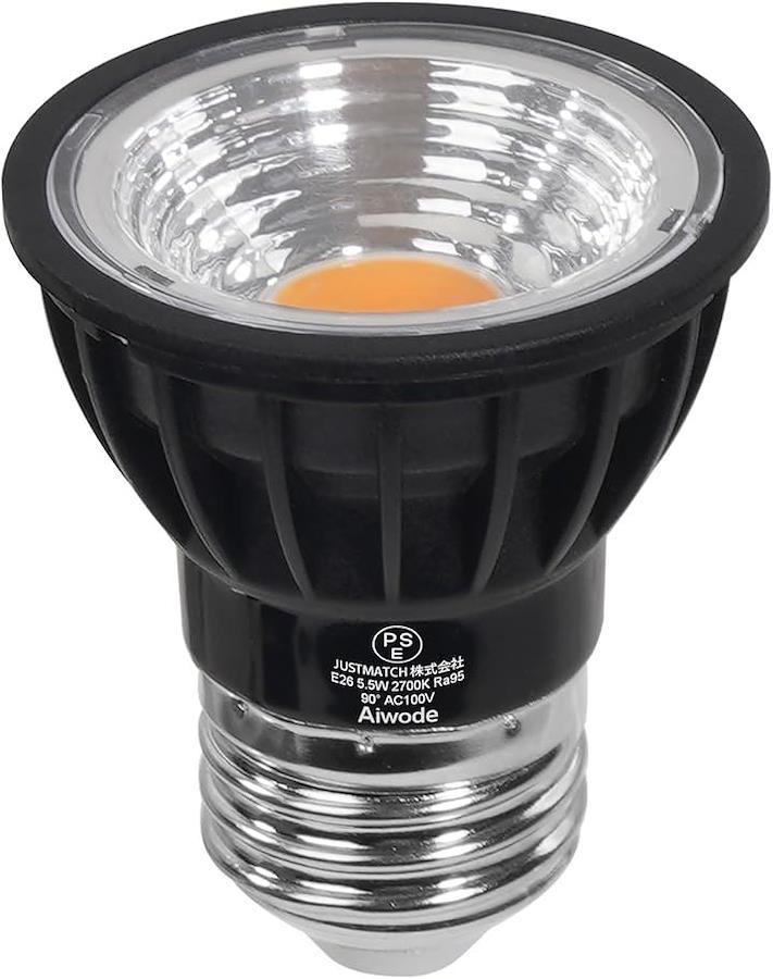 1、演色指数(CRI):95Ra、消費電力:5.5W、全光束:550lm、ビーム角度:90°、色温度:電球色2700K、口金:E26、包装:1個入り、ボディカラー:ブラック、サイズ [外径x長さ]:50mm x 60mm。