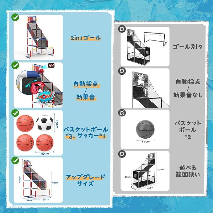 【2in1バスケット/サッカーゴール】ほかのバスケットゴールと違い、当製品はサッカーゴールを追加しました。2種類のおもちゃを購入する必要がなく、1つのセットで、バスケットとサッカー、2方の遊び方が一気に実現できるようになりました。また、バスケットボール*3、サッカーボール*1を付属されて、一人のスポーツゲームはもちろん、多人ゲームも適用されます。バスケットボール・サッカー、両方に興味のあるお子様へのプレゼントに最適です。 【電子スコアリング&効果音】バスケットボードにはLEDディスプレイとセンサーが搭載されて、バスケットボールがゴールに入ると、センサーから感知させるので、LEDディスプレイが自動採点します。そのほか、スピーカーも設置させているので、採点の同時に、歓声も流れます。自動採点、歓声のあるバスケットゴールで対戦ゲームすれば、緊張でワクワうな雰囲気が溢れ、臨場感も味わいます。 【インドア&アウトドア適用】組立式なので、31*18*41cmのケースに収納すれば、室外への持ち運びが便利です。公園、キャンプなどの場所で、友達、親と一緒に当製品を簡単に組み立てると、この場もすぐにバスケットボールとサッカーの練習場になれます。天気が悪い時も、外出できない時も、当製品を自宅で設置すれば、インドアスポーツに変わります。季節を問わず、天候に関係なく、いつでもスポーツが楽しめます。 【安定性・便利性・サイズがアップ】製品本体のサイズが160*97*51*71cmにアップグレードし、遊べる範囲が狭くなく、子供のほか、大人も思う存分に遊べます。また、チューブの厚さも1.4㎜に変更するので、より良い安定性を提供しています。年齢を問わず、誰でも安心で、心ゆくまでバスケットボール・サッカーを楽しむことができます。また、スロープ状のネットもついているので、バスケットボールが戻ってきます。頻繁にボールを回収する必要がありません。 【高品質・環境に優しい素材】高密度バスケットボールネット、強化されたバスケットゴールリングで構成されたバスケットボール・サッカーゴールセットは、寿命が短いおもちゃではなく、長期使用できるおもちゃです。また、付属されたボールは環境にやさしく、柔らかい PVCで作られ、子供の肌に優しいです。直径15cmでお子様にも握りやすいサイズです。子供のバスケットボール・サッカー練習用おもちゃに最適です。