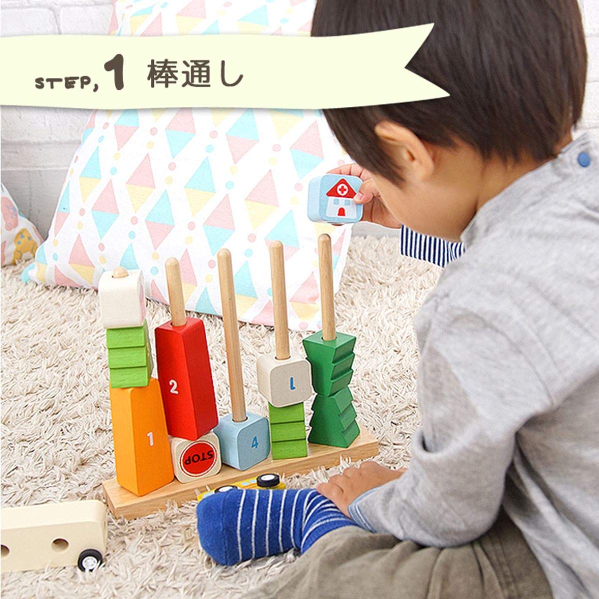 1台4役!種類分け(ソーティング)、数の数え方(カウンティング)、紐通し、ごっこ遊びなどの知育遊びが詰まった楽しい木のおもちゃ。 知育遊びのほかにも、乗り物をモチーフにしたパーツを動かしたり、街を作ってごっこ遊びを楽しんだりと、多機能で長くお楽しみいただけます。 本体にパーツをはめ込む指先トレーニングをしながら、お片づけの練習にもピッタリな木のおもちゃです。重量:682g 【セット内容】本体×1、パーツ×15、スティック×5、紐通し用スティック×1 【対象年齢】12ヶ月~ 【素材】ゴムの木、POM、コットン 【サイズ】箱サイズ:高6×幅23.5×奥20.5cm 商品サイズ:高19.5×幅22×奥4.5cm 重量:682g 【セット内容】本体×1、パーツ×15、スティック×5、紐通し用スティック×1 【対象年齢】12ヶ月~