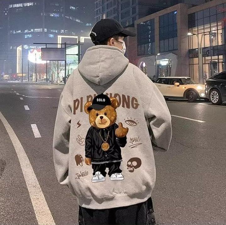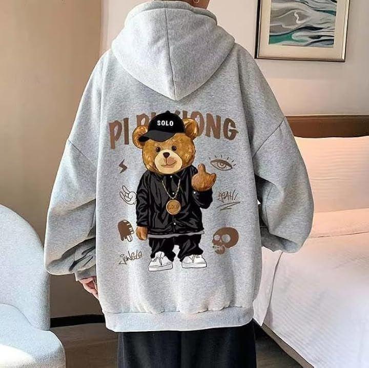 クマのバックプリントがポップで可愛らしい、カジュアルパーカー