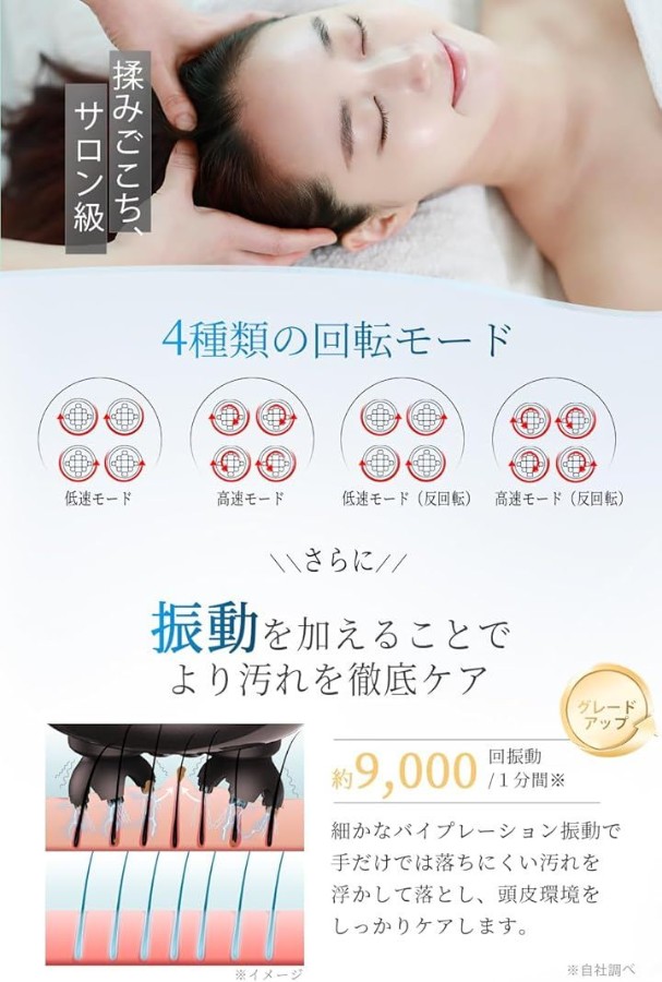 1分間に約9000回の振動で、シャンプーしながらご使用いただくことで、手だけでは落ちにくい汚れもスッキリ洗浄され、柔らかな地肌へと導かれます。