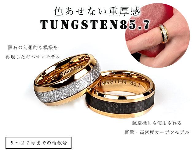★重厚感あふれる希少金属「タングステン」を使用したリング!*内側には「TUNGSTEN85.7」と刻印されており、高純度&国際規格の証です。*レアメタル「タングステン」とは金とほぼ同比重で重厚感と高級感を兼ね備えた素材です。ダイヤモンドに匹敵するほどの強度を誇り金属の中でもっとも融点が高く宇宙ロケットの部材にも使用されています。人体への影響が少ないことからCT装置に使用されるなど医療分野でも活躍している素材で、金属アレルギーを起こしにくく滅多なことでは傷つかない希少金属としても有名です。その強度は50年手入れしなくても輝き続けるといわれており、色あせない重厚感をお楽しみ頂けます。*おしゃれなコンビ柄で2タイプご用意しました。航空機にも使用される軽量・高密度のカーボンモデル。黒と側面は2面カットになっており、引き締まったデザイン隕石の幻想的な模様を再現したギベオンモデル。側面は丸みを帯び、柔らかいデザイン