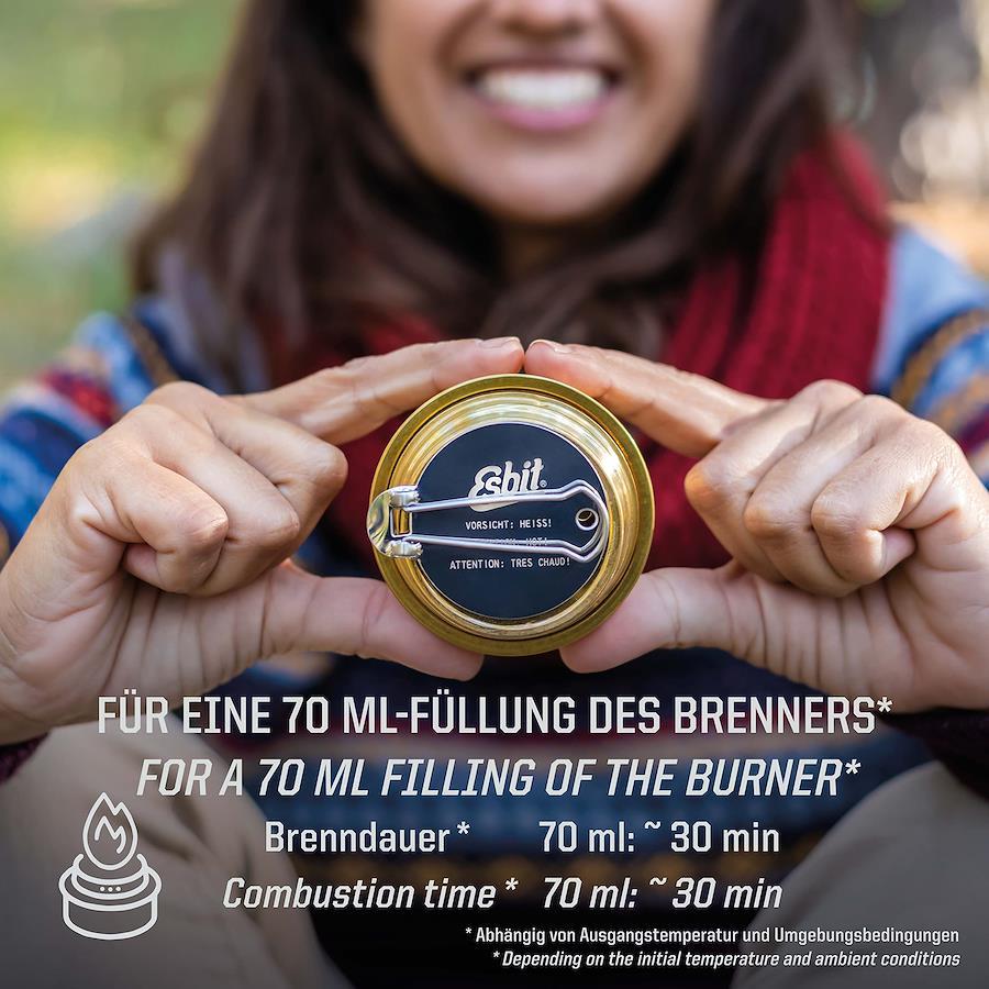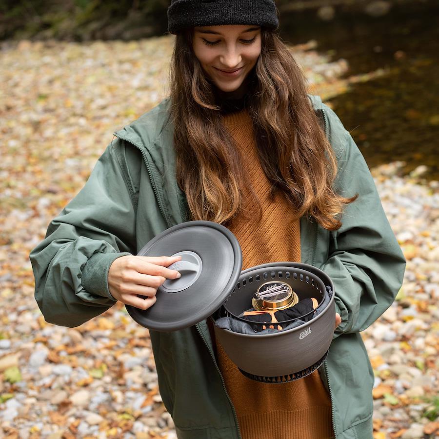 Esbitのアルコーコールバーナー専用アルミクックセットです。2~3人のキャンプに適した大きさで軽量コンパクトに収納できます。燃料は入手しやすいメチルアルコールを使用し着火が簡単、約70mlほどの燃料で約25分の燃焼可能。燃焼効率をアップするため2つのポットには[ヒートエクスチェンジャー]搭載。メッシュバッグ付属でウインドシールドはポット内に収納可能。