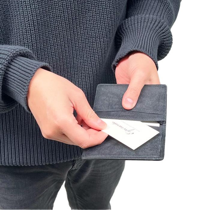 フラットタイプとマチ付きのポケットを付けた機能的なカードケース。シンプルなデザインでビジネスシーンにも重宝します。表面はわざと毛羽立たせる加工をしているため、ファーストタッチは少しザラザラした感触ですが時間が経つにつれて、そのザラザラ感はなくなり艶々に生まれ変わります。一度育てた革は手放したくなくなる品になり、革好きには人気のレザーになります。この革は、フランス産の原皮を使用し、植物から抽出されるタンニンエキスを時間をかけて原皮に浸透させ、独自の調合された牛脚油で加油する手間をかけたバケッタ製法という伝統的な技術でつくられております。化学薬品を使用したクローム鞣しに比べ、時間もかかりその分コストも高くなりますが環境にも優しい素材です。