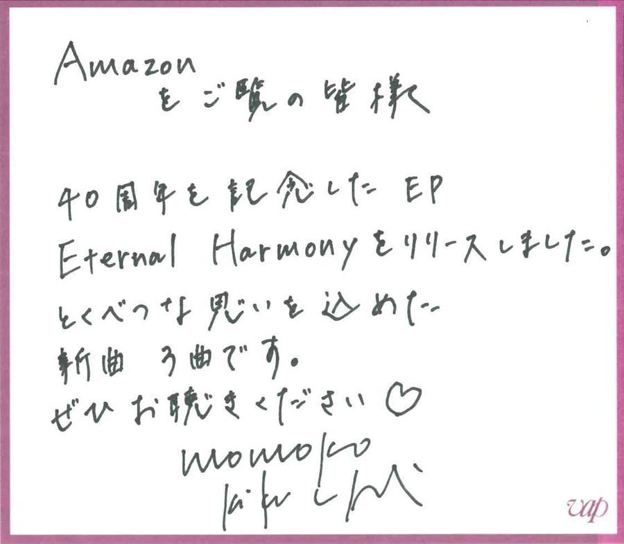 〈commented by 菊池桃子〉40 周年記念として「Eternal Harmony」をリリースさせていただくことになり、応援してくださる皆様、作品を提供してくださる作家の皆様、スタッフの皆様に大変感謝しています。内澤崇仁(androp)氏には、音楽家としての瞬発力と力強さを学ばせていただき、それが情熱となり楽曲に反映されました。ホリエアツシ(ストレイテナー)氏には音楽に向き合う美しさと、繊細な感性を楽曲に取り入れる丁寧さを近くで学ばせていただきました。どちらも、1日も早く皆様に聴いていただきたい思いです。自分で曲と詩を書いた楽曲「Starry Sky」は、自分に最も近い音楽家である林哲司先生のイズムを私なりに継承したいと考えアドバイスを頂戴いたしました。「Eternal Harmony」というタイトルの通り、制作側の皆様と、お聴きいただく全ての皆様と一緒に最高の「永遠の調和」を奏でたいと思います。