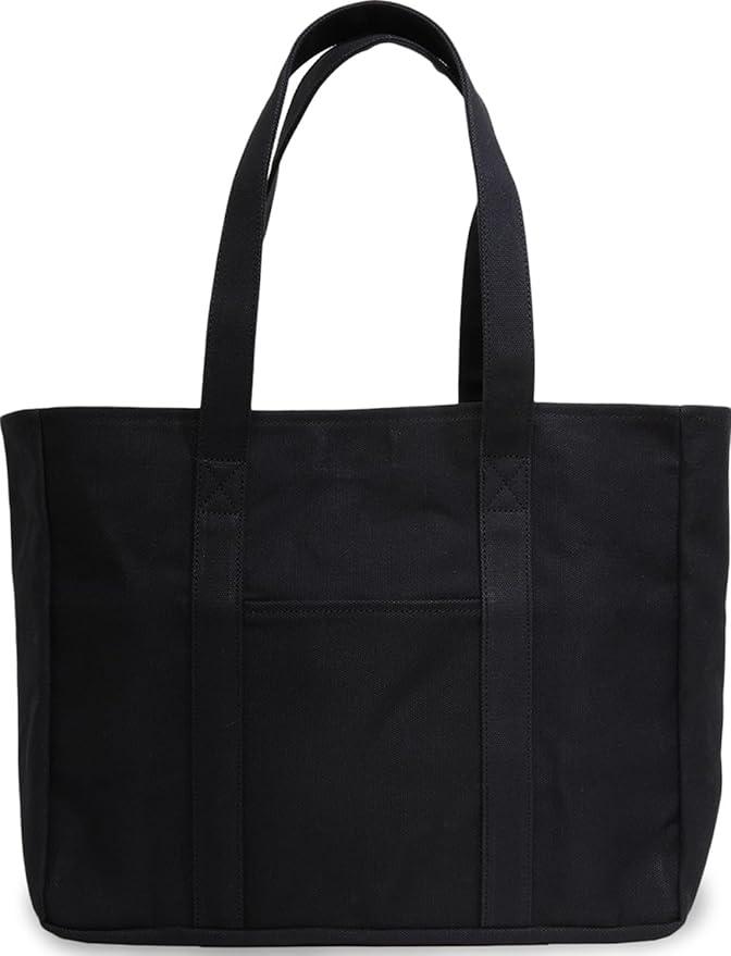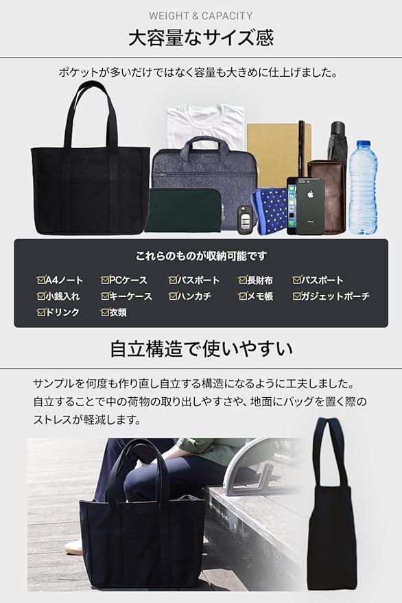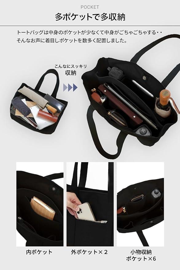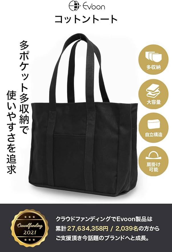 [Evoon] トートバッグ キャンパス無地 コットン 多ポケット多収納で大容量 メンズ レディース (M%カンマ% ブラック)